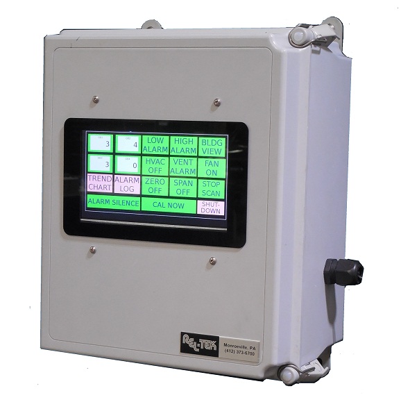 - 10 A 7” touch-screen color monitor on the front of the controller provides HMI graphics showing sensor values, alarm status and locations. Custom graphics, with your own screen logos, available. Setup tools, a library of icons, and instructions are provided.
